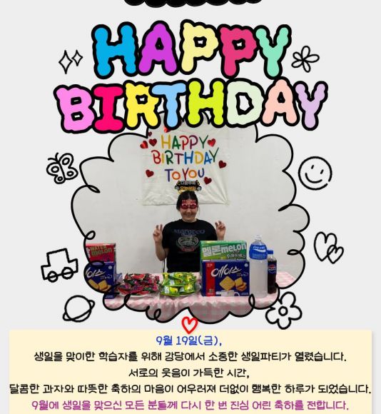 MORE9월 19일(금), 생일을 맞이한 학습자를 위해 강당에서 소중한 생일파티가 열렸습니다.서로의 웃음이 가득한 시간, 달콤한 과자와 따뜻한 축하의 마음이 어우러져 더...