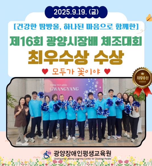 MORE2025. 9. 19(금)제16회 광양시장배 체조대회에서광양장애인평생교육원 '모두가 꽃이야'팀은 "최우수상"이라는 값진 성과를 거두었습니다.그동안 흘린 땀방울과 끊임없는 연습,...