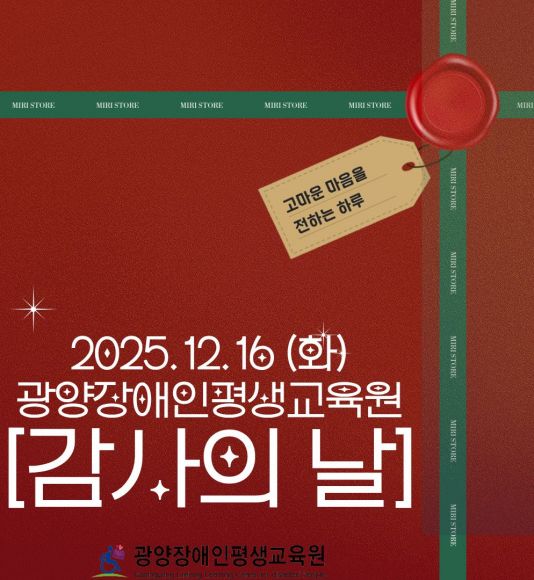 🎁2025년 광양장애인평생교육원 감사의날 안내 ✨안녕하세요광양장애인평생교육원 교사 김다희입니다.2025년 한 해 동안 광양장애인평생교육원과 함께하며큰 사랑과 따뜻한 나눔을 실천해 주신 모든분들께 깊은 감사의 마음을 전하고자 합니다.여러분께서 보내주신 관심과 응원이 모든 활동에 큰 힘이 되었습니다.한 분 한 분의 마음이 모여 한 해를 아름답게 채워주신 만큼,작은 자리이지만 그동안 감사함을 직접 전하고 함께 따뜻한 시간을나누고자 하니 함께 해주시면 감사하겠습니다.자세한 일정과 장소는 안내 포스터를 참고해 주시고여러분의 소중한 발걸음을 기다리고 있겠습니다.늘 함께 해주셔서 진심으로 감사드립니다. 2025-12-10 더보기